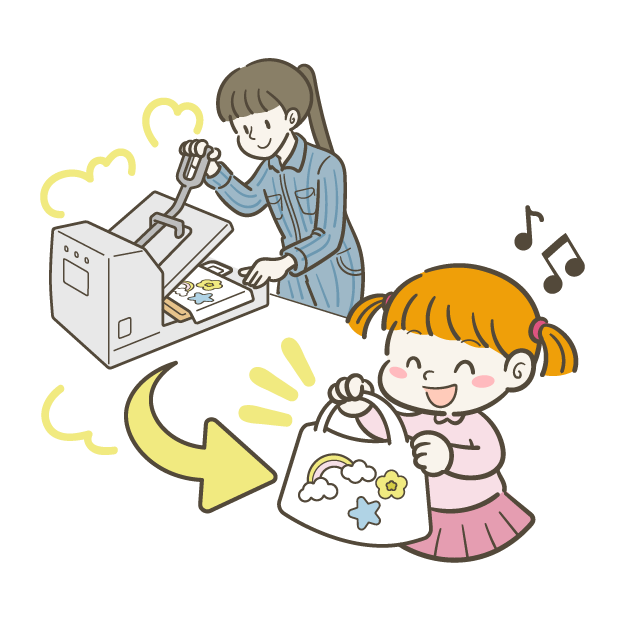 プレスして、完成あとは、カタチにするだけ!スタッフがヒートプレス機で、パッチを貼り付けます。選んだ組み合わせが、そのまま製品に。